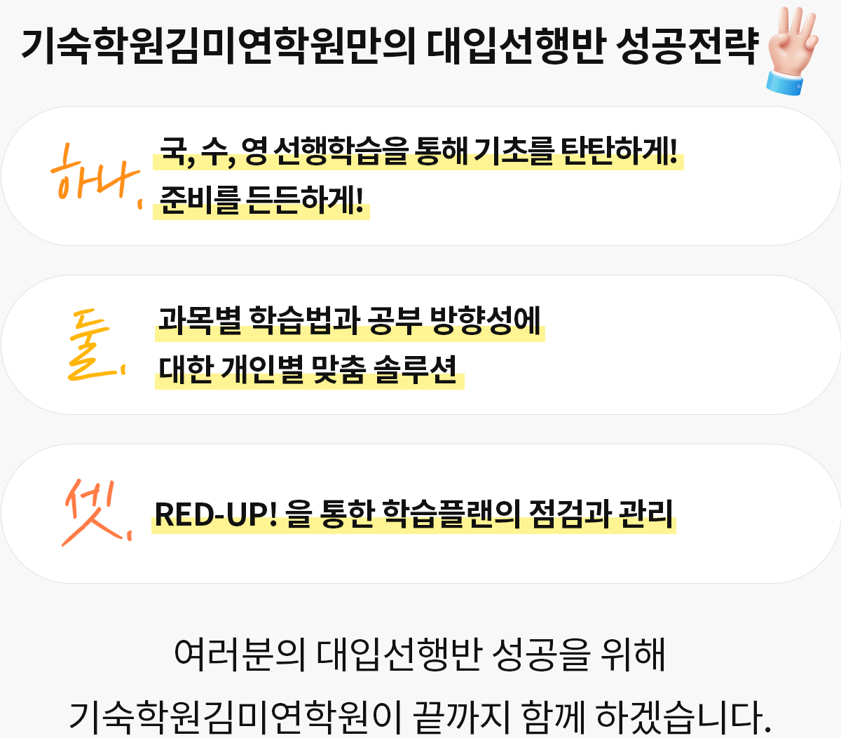 기숙학원김미연학원은 선행반 학생들을 체계적으로 관리하여 이들의 꿈을 이룰 수 있도록 함께하겠습니다.